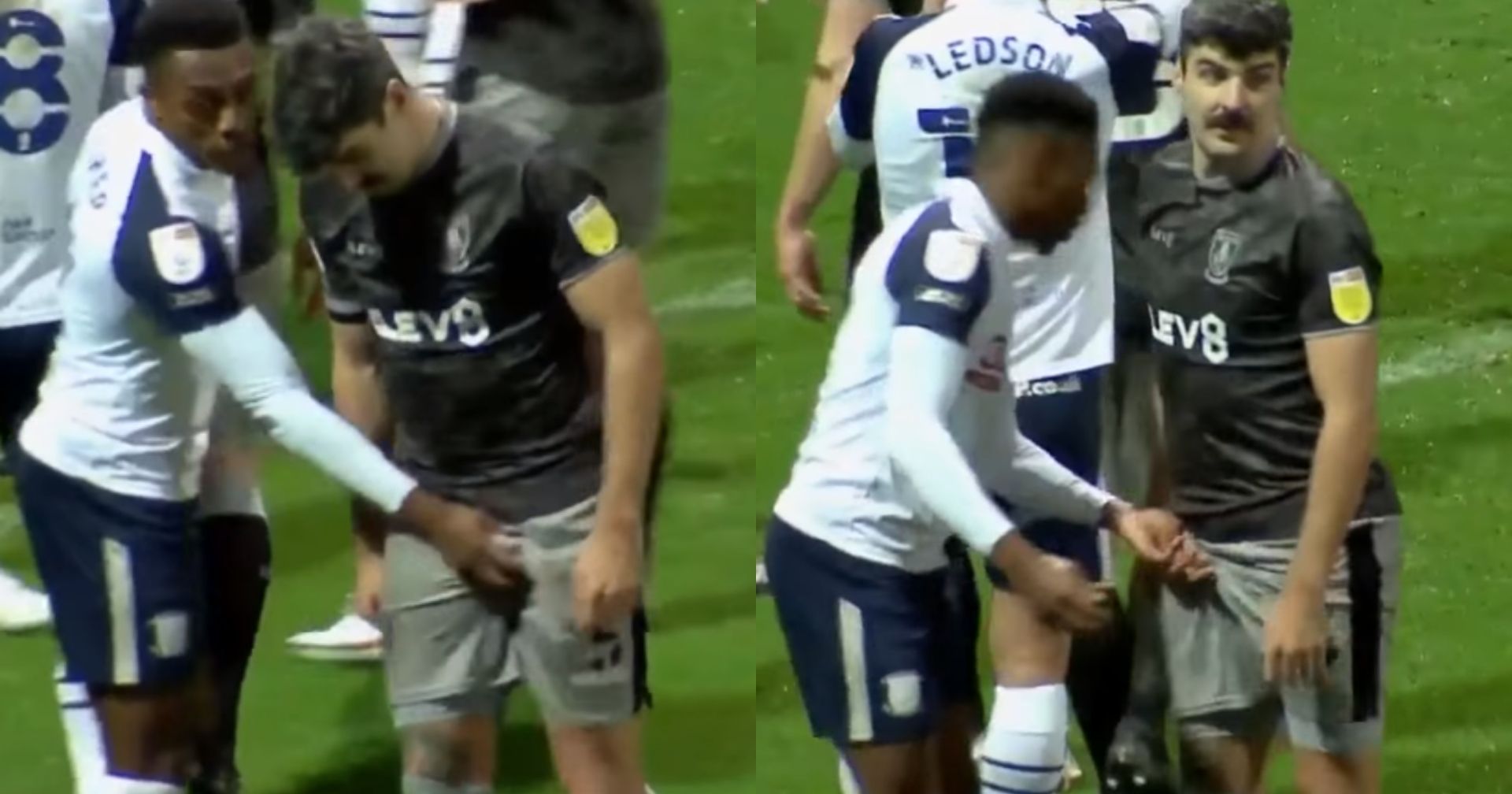 Der er tale om en episode i forbindelse med et hjørnespark, hvor Prestons Darnell Fisher, ikke bare én, men to gange tager Sheffield Wednesdays Callum Paterson i skridtet, hvilket kan ses i videoen herunder.