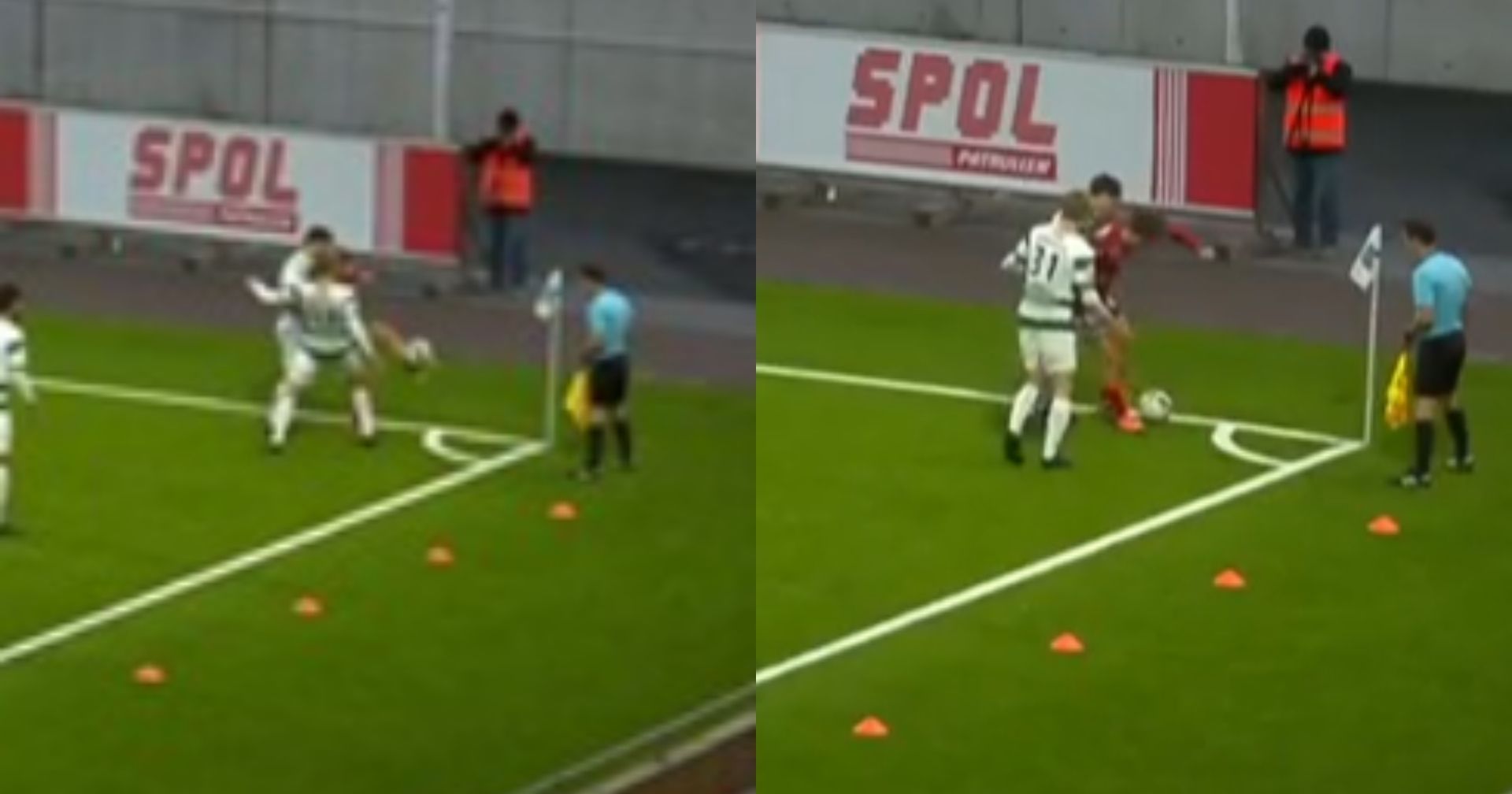Episoden fandt sted efter godt en halvtimes spil, da den 19-årige offensivspiller Herman Sjögrell blev isoleret af to Västerås-spillere ved hjørneflaget i en situation, der umiddelbart så ud til at være umulig at komme ud af.