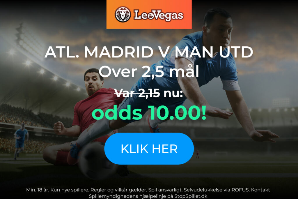 Er du mere interesseret i aftens andet CL brag, så har LeoVegas et godt oddsboost til dig. De tilbyder nemlig odds 10.00 på over 2.5 mål i Atlético Madrid vs Manchester United. Hvis du ville have del i tilbuddet, så klik på grafikken nedenunder.