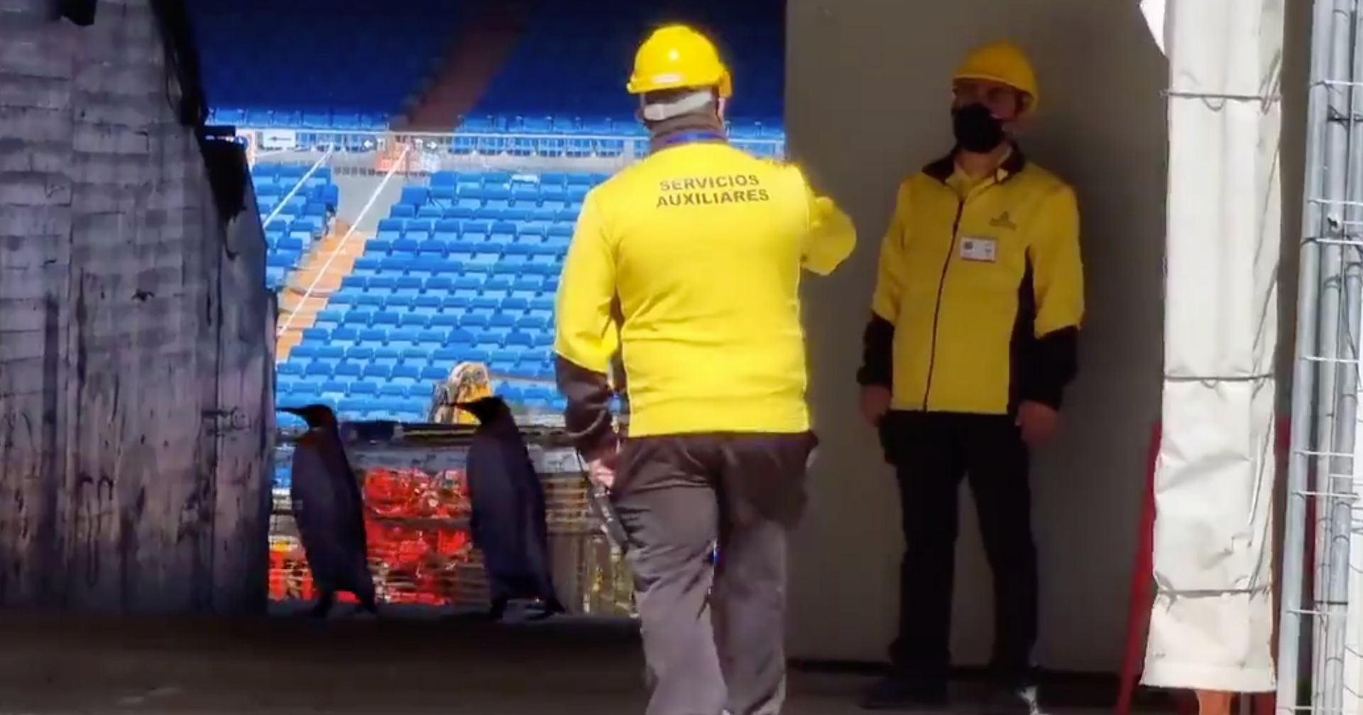 I dag var der dog andet end flot arbejdere på Real Madrids stadion. To pingviner blev nemlig spottet i baggrunden, da der blev filmet ved indgangen den enorme arena.