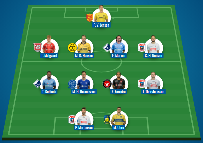 Klubben med flest repræsentanter på rundens hold er dog AGF, der har tre spillere, i form af Casper Højer, Patrick Mortensen og Jon Dagur Thorsteinsson, med.