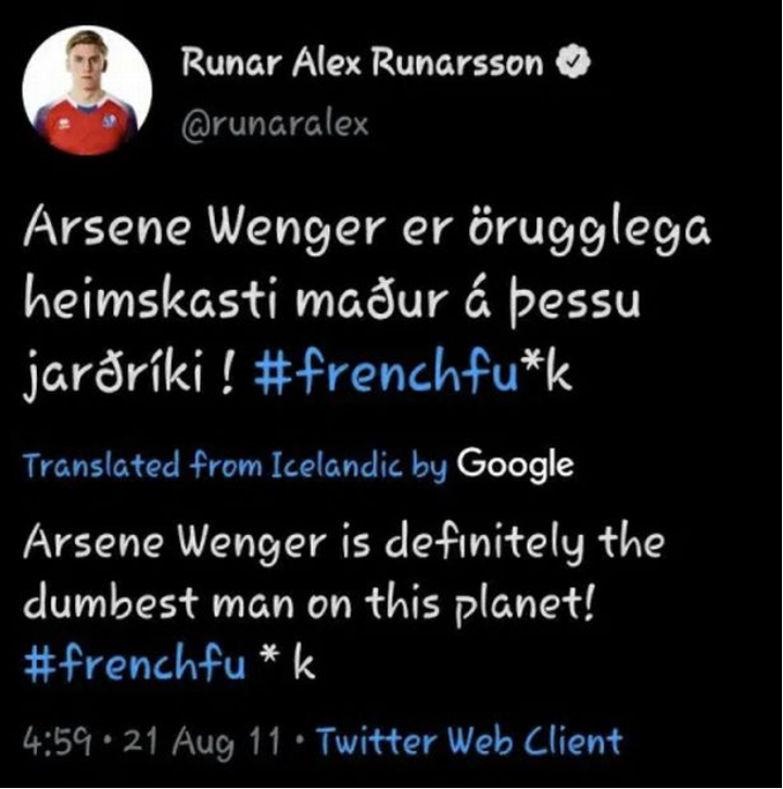 Når en ny spiller kommer på radaren i en klub som Arsenal, skal holdets supportere selvfølgelig lige tjekke op på, hvad han er for en slags. Her er man blandt andet stødt på et lidt uheldigt Twitter-opslag, hvor Runarsson sviner holdets tidligere træner Arsene Wenger til.